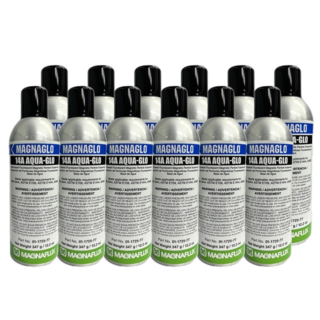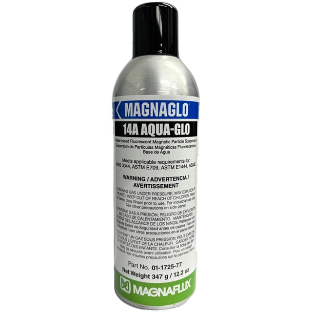 This water-based, non-flammable formula contains high-sensitivity 14A fluorescent magnetic particles and is primarily used for field testing with a portable magnetic field generator. 14A Aqua-Glo is ready-to-use, and creates a bright yellow-green fluorescent indication when viewed with ultraviolet light. The ultra-sensitive particles provide clear, bright, fluorescent green indications under ultra-violet light for unbeatable inspection quality and accuracy.