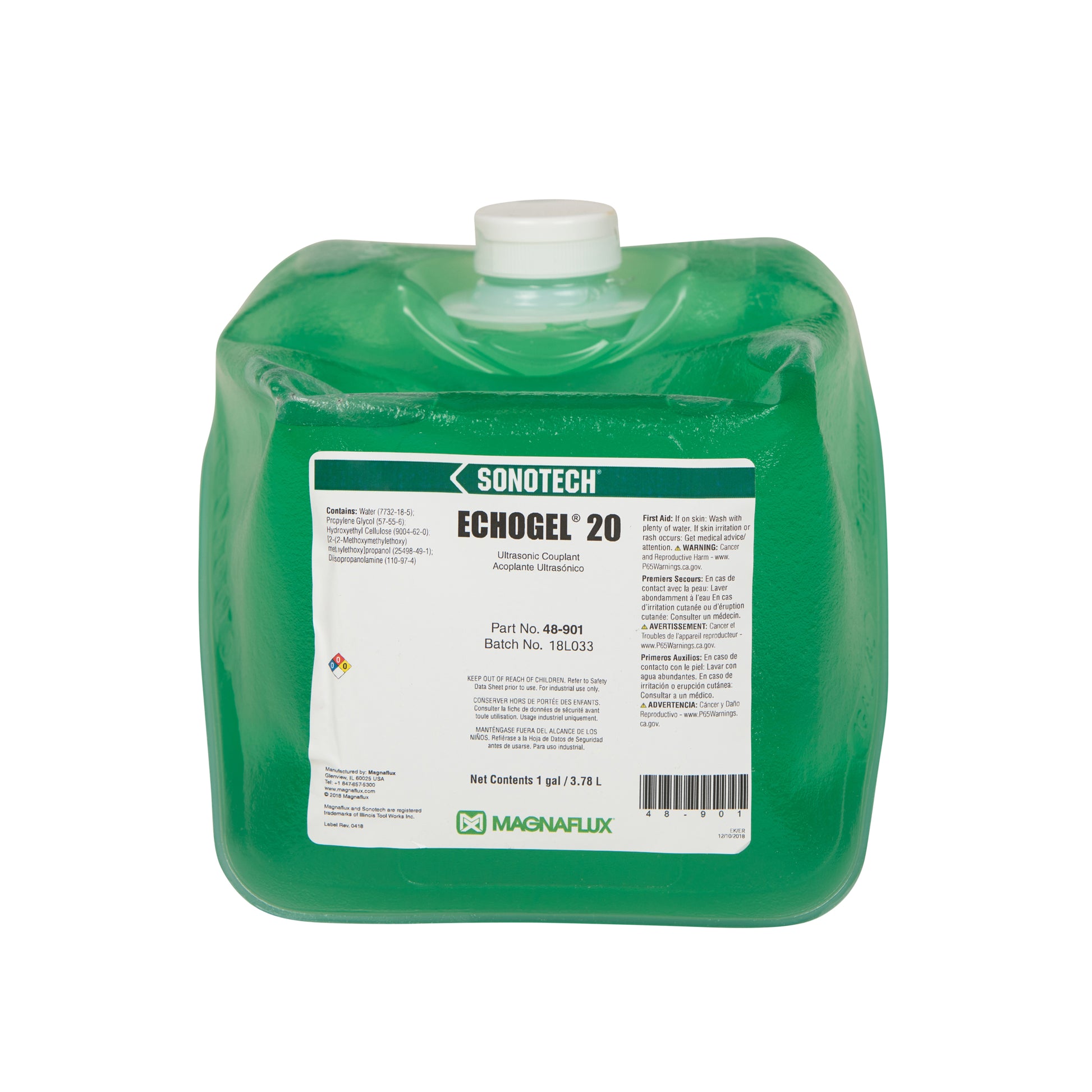 Echogel® 20 is an economical, basic-use couplant in medium-thick gel viscosity for ultrasonic inspections, like flaw detection/sizing and thickness gauging, where salt cake or metal corrosion salts are present. It provides good corrosion inhibition and resists viscosity breakdown on salt-caked boilers and other corroded materials.