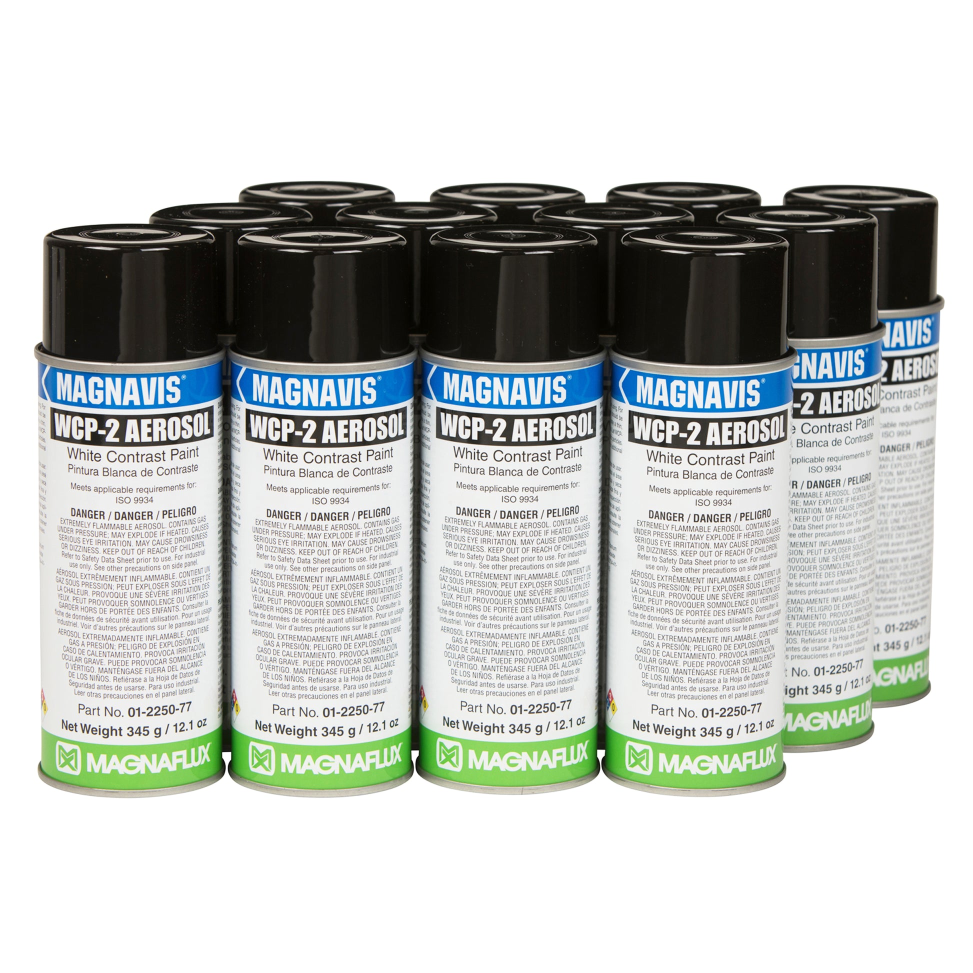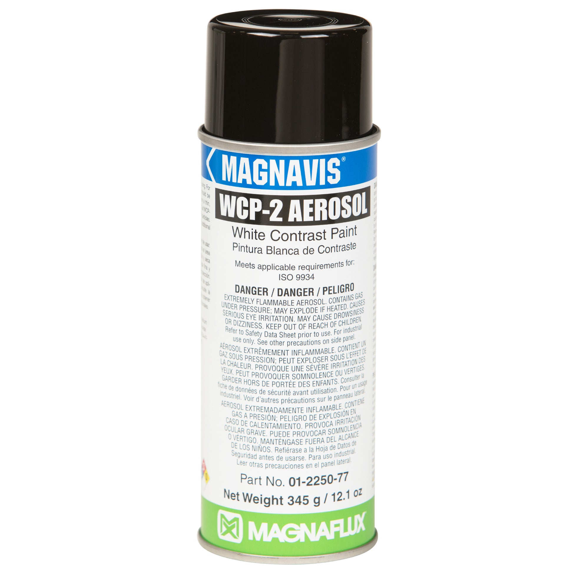 This fast-drying paint aerosol sprays on evenly, without flaking, before inspection so when non-florescent / colored magnetic particles are applied, the indications appear clearly against the opaque white background.