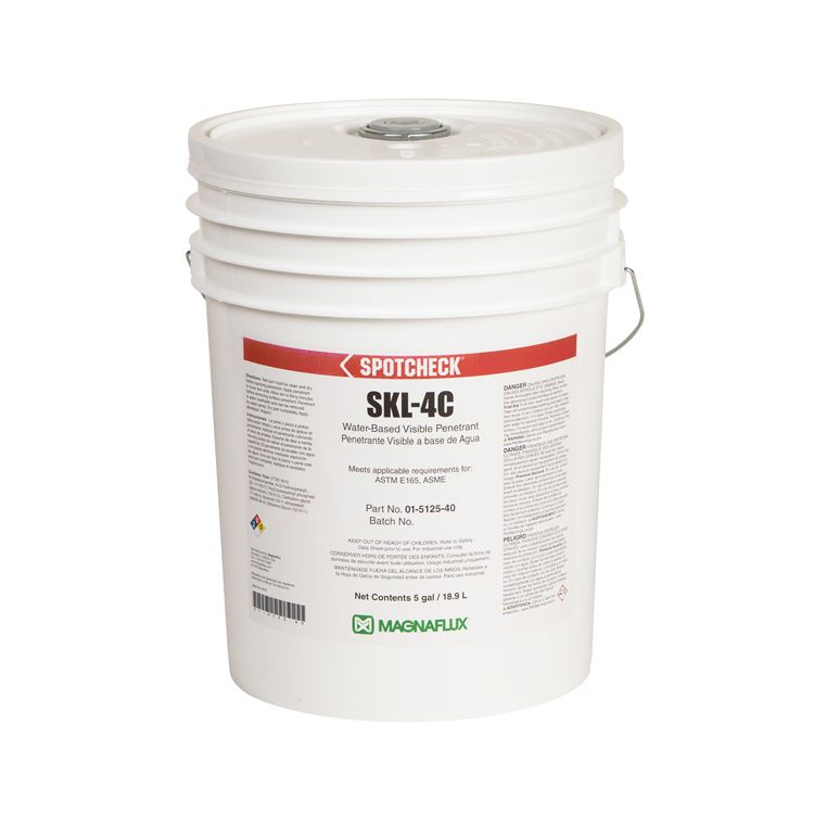 Specially designed for chemically sensitive plastic parts, and for leak detection, SKL-4C is a red dye visible penetrant that is water based and water washable. As with most plastic parts, it is recommended that a trial application be used to confirm compatibility. Indications appear dark purple-red in visible light and fluorescent orange in ultraviolet light. This allows dual range flexibility in the inspection process. SKL-4C can be diluted with water, although it is recommended that a dilution ratio of 1:1 is used for general purposes.